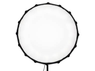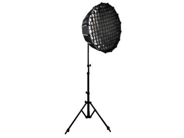 Easy setup via special locking mechanism for every rod as well as easy fold-down via unlocking buttons at the mounting frame. Attaches to the light via bayonet mount.