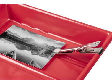 Stainless steel, insensitive to photochemicals. With spiral spring and catch for hanging on side of tray. With protective caps especially designed for working with plastic-coated papers.