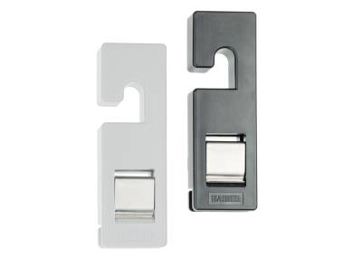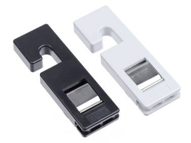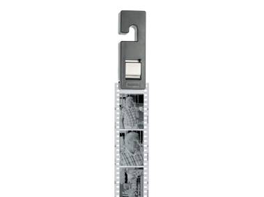 For hanging up wet films. 3-hole clip mechanism. Plastic with stainless steel spring.