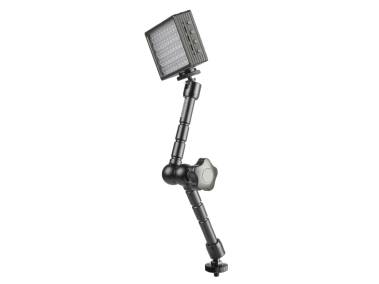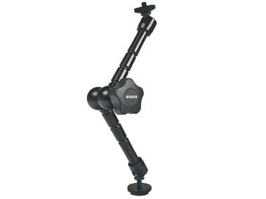 To mount and individually align cameras, lights and accessories. With ball-and-socket joints at both ends. Both ball-and-socket joints and the middle joint are released and tightened by a central locking disk. Sturdy metal design. 1/4" camera connection thread. Mounting via slide-in foot, 1/4" male and female thread is possible with adapters included. Max. load 2 kg (4.4 lbs.), in horizontal position 1 kg (2.2 lbs.).