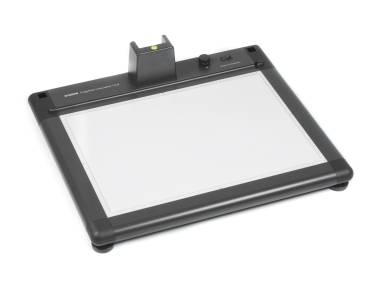 Trans-illuminator with 270 SMD LEDs, 6000 Kelvin daylight, color rendering index (CRI) = 95, serviceable illuminated area 50.6 x 36 cm (19.9 x 14.2 in., > tabloid format), illuminance approx. 8300 cd/m², brightness continuously dimmable, flicker-free operation. Mounting fixtures for optional RB 5270 DX (5278) and RB 525 AS (5284) surface lighting units. Height-adjustable feet. Column base with spirit level for 70 mm (2.8“) wide column.