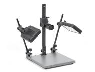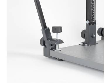 RS 2 CP copy stand (5301) with non-reflective matt grey base board with printed fine grid and cm/inch scale. Matt-black anodized aluminum section tube column with cm/inch scale. Hand-cranked height adjustment by friction drive in plastic bearings. With horizontally adjustable camera arm to change the distance to the column, moves approx. 7 cm (2.8 in.) back and forth. 1/4” mounting thread. Column folds down on base board.