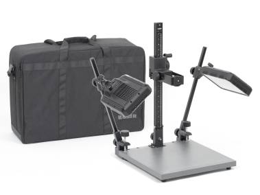 Portable and foldable copy stand, incl. LED lighting unit with two PL 24D daylight soft lights. In strong carrying case.
