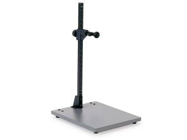 Super-compact camera stand for small, lightweight cameras (APS, digital compacts, CCD cameras, etc.). Non-reflective, matt grey baseboard. Column with cm/inch scale. Height-adjustable camera arm. 1/4” mounting thread.