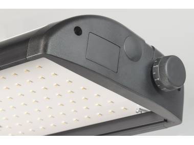 LED daylight lighting unit with two light banks for even and soft illumination. Emitted light has absolutely no IR and UV content. Constant current driver for flicker-free operation. Each light equipped with 192 selected white SMD LEDs 5600 Kelvin, CRI: 96. Elaborate passive cooling via LED board and light metal housing.