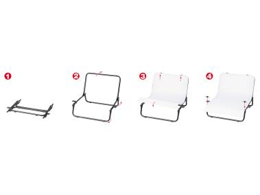 Compact shooting table for small object photography without an interfering background. Comprised of a foldable tubular steel frame and a white translucent plastic sheet with preformed front edge. Easy setup and take-down without need of tools, space-saving storage. Base frame with nonskid feet.