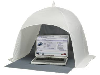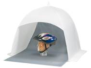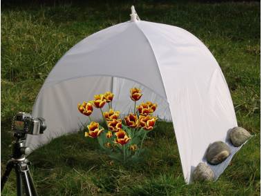 For small object photography. Suitable for product shots and internet images. White translucent surfaces provide for even and soft illumination. Umbrella-type construction makes set-up and fold-down easy. Comes with reversible textile background (white and grey) and protective cover with carrying straps.
