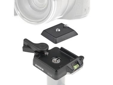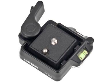For quick mounting of camera on tripod. The upper part is mounted on the camera’s tripod bush and stays there, the lower part is attached to the tripod. Release lever with additional safety lock, three spirit levels for precise positioning, 3/8" tripod thread with 1/4" thread adapter.