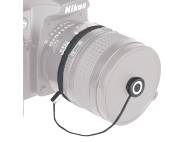 Protects against loss of lens cap. A self-adhesive plate is stuck to the lens cap and attached to the lens by an elastic cord.