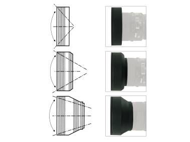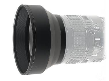 For lenses with 28 to 200 mm focal length (35 mm equivalent). Made of matte black silicone, foldable. With light baffles. Metal screw-in mount. Filter thread.