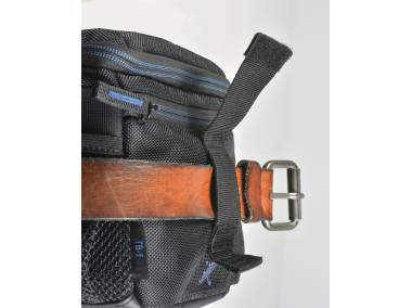 The 2in1 belt loop has a Velcro fixture and a sewed up loop. Thus it is possible to fasten the bag on the hip when it is carried on the shoulder or carry the bag solely attached to the belt.